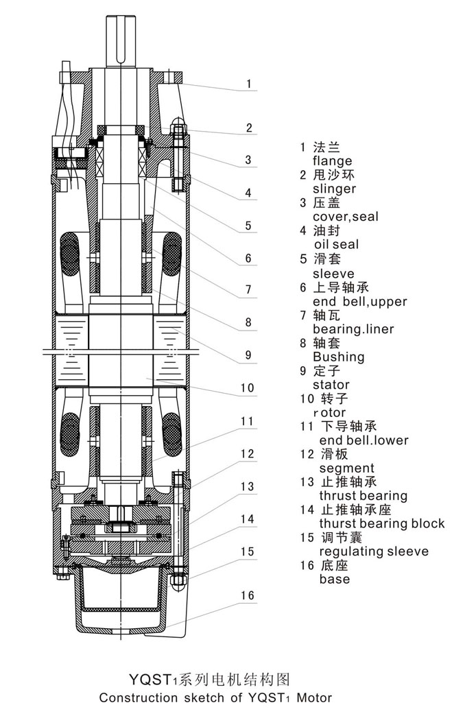 概述 YQST系列大容量潛水三相異步電動(dòng)機(jī)是應(yīng)國(guó)際市場(chǎng)需要,在小井徑中發(fā)展大容量電機(jī)而專門開發(fā)的一種新型潛水電機(jī),他特別適用于高揚(yáng)程潛水泵配套提取地下水,為城市工礦企業(yè)、農(nóng)業(yè)灌溉及居民生活提供生產(chǎn)和生活用水。本產(chǎn)品除具備一般井用潛水電機(jī)特點(diǎn)外,還具有單機(jī)容量大,力能指標(biāo)高,承受軸向力大,密封性能好等特點(diǎn)。為了適應(yīng)用花需要,電機(jī)機(jī)殼可采用不銹鋼材料,但需在合同中注明。 型號(hào)說明