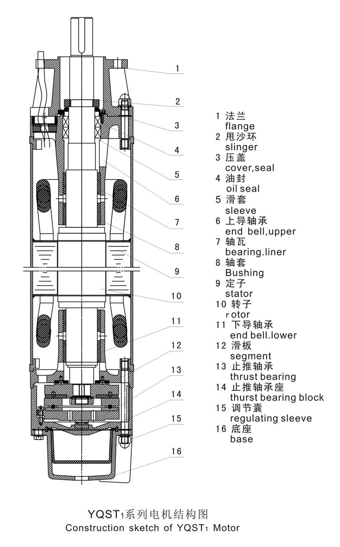 概述 YQST系列大容量潛水三相異步電動(dòng)機(jī)是應(yīng)國際市場需要,在小井徑中發(fā)展大容量電機(jī)而專門開發(fā)的一種新型潛水電機(jī),他特別適用于高揚(yáng)程潛水泵配套提取地下水,為城市工礦企業(yè)、農(nóng)業(yè)灌溉及居民生活提供生產(chǎn)和生活用水。本產(chǎn)品除具備一般井用潛水電機(jī)特點(diǎn)外,還具有單機(jī)容量大,力能指標(biāo)高,承受軸向力大,密封性能好等特點(diǎn)。為了適應(yīng)用花需要,電機(jī)機(jī)殼可采用不銹鋼材料,但需在合同中注明。