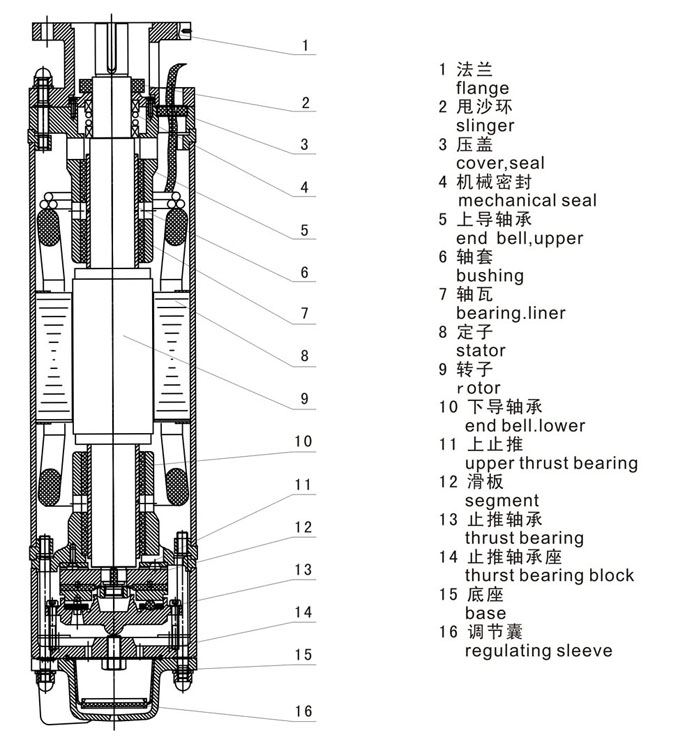 注:高推力型軸承需特殊訂貨,采用高推力型軸承的電機性能由用戶與制造廠協(xié)議。適用條件 1、電動機應完全潛入水中立式(或臥式適用),其潛入深度不大于70m,但不小于20m,最底位置距井底不少于5m(臥式使用時水位應高于潛水電機1m以上)。 2、介質水溫不高于20℃。 3、水中固體雜質含量(重量比)不超過0.01%。 4、水中氯離子含量不得超過400mg/L; 5、水中硫化氫含量不得大于1.5mg/L; 6、介質水中不含腐蝕性物質,PH值在6.5-8.5范圍內。 7、電機運行時內部應充滿潔凈的清水(可加防凍液)。 設備特點 ★ 電機防護等級:IPX8,絕緣等級為F; ★ 充水式潛水電動機結構簡單,定轉子繞組和鐵心直接浸在水中,冷卻效果好、輸出功率大、效率較高。 ★ 由于充水式潛水電動機內腔所充多為清水,使用過程中產生的滲漏對所安裝使用井水水質不會產生污染。 ★ 充水式潛水電動機的定子繞組。鐵心很軸承均在水中工作,對定子繞組所使用上網導線及其加工工藝、接頭材料及包扎工藝、水潤滑軸承的結構、材料及加工工藝、鐵心與金屬材料的防銹防腐蝕處理等有很高的要求。 電動機結構 1、 潛水電機由定子、轉子、上下導軸承、下連接法蘭、底座、軸伸密封裝置等組成。 2、 潛水電機各止口連接處采用密封圈密封;軸伸密封根據水質含砂量多少,選擇不同方式的密封裝置。(含砂量大于0.01%時采用橡膠骨架油封;含砂量大于0.01-0.5%時采用機械密封) 3、 電動機下部裝有橡膠調節(jié)囊,其作用為當電機內部熱脹冷縮時及電機外部水位高低變化時,用以平衡電機內腔與水的壓力。 4、 電動機定子繞組采用耐水絕緣線,有良好的絕緣能力,繞組線與耐水JHS型電纜連接。 5、 潛水電機上、下導軸承座內裝有軸瓦,轉子下部裝有止推軸承。止推軸承由上、下止推軸承及滑板組成,用于承擔軸向力。