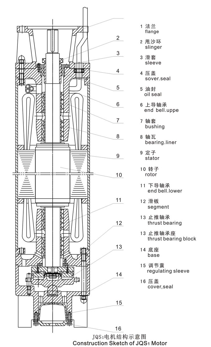 JQS 系列井用潛水三相異步電動機為濕式充水密封型機構(gòu),主要用于8’’、 10’’深井中驅(qū)動潛水泵提取地下水,為城市、工礦企業(yè)、農(nóng)田灌溉、牧場和居民生活提供生產(chǎn)和生活用水。JQS 1 系列電機設計合理,并經(jīng)多年生產(chǎn)實踐經(jīng)驗屢加改進,具有機構(gòu)簡單、噪音小、性能優(yōu)良、使用可靠、維修方便、運用于水中、節(jié)約基礎投資等特點。