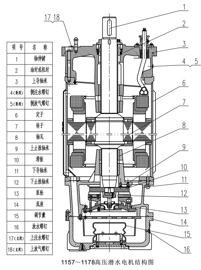 概述 1142-1178系列井用高壓潛水電動機是我公司在引進國際技術(shù)的基礎(chǔ)上開發(fā)研制的產(chǎn)品系。該潛水電動機與潛水泵組成潛水電泵,長期潛入水中工作,主要用于在深井中驅(qū)動潛水泵提取地下水,礦坑井下排水、電廠供水、鋼廠供水、農(nóng)業(yè)大型排灌。本系列產(chǎn)品壽命長,易于維護,是目前最理想的提水設(shè)備。 型號說明