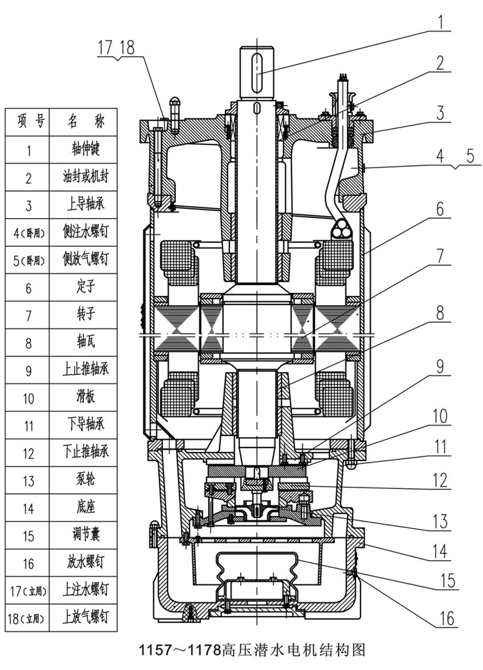 概述 1142-1178系列井用高壓潛水電動機是我公司在引進國際技術的基礎上開發(fā)研制的產(chǎn)品系。該潛水電動機與潛水泵組成潛水電泵,長期潛入水中工作,主要用于在深井中驅(qū)動潛水泵提取地下水,礦坑井下排水、電廠供水、鋼廠供水、農(nóng)業(yè)大型排灌。本系列產(chǎn)品壽命長,易于維護,是目前最理想的提水設備。 型號說明